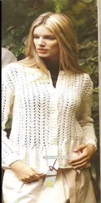 1 ilmek kesilir, 1 ilmek düz örülür, 2 ilmek kesilir,1 ilmek artırılır, 3 ilmek düz örülür şeklinde ilmekler dizilir. Arka sırada bütün ilmekler düz örülür. 2. sırada 8 ilmek düz, artırılan ilmek de düz örülür. 1 ilmek artırılır, 3 ilmek 1 kerede örülür,2 ilmek kesilir, 1 ilmek artırılır şeklinde sıra tamamlanır. 16 cmörüldükten sonra düz örülen 8 ilmek burulur. 2′şer ilmek kesilerek burgular 4′er ilmeğe düşümlün Ajurun aralarında düz örülen 4′er ilmek her iki sırada bir burulur. Toplam 42 cm örülerek kol evi için yanlardan 3+2+1 ilmek kesilir. 20 cm daha örülerek arka yaka için ortadaki 28 ilmek bir defada kesilir.