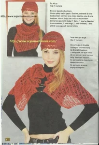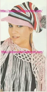 Yapılışı:100 ilmek başlanır, 2 cm lastik örgü yapılır. Sonraki sırada 10 ilmek düz, 5 ilmek ters örgü yapılır. 8 sıra bu şekilde örüldükten sonra 10 ilmek düz örülen ilmekler 5+5 saç örgüsü yapılır. Sonraki burgu 16 sıra sonra uygulanır. 22 cm örüldükten sonra ner 4 ilmekte bir, l ilmek kesilir. Sonraki sırada kalan İlmekler iğne yardımı ile bir kerede toplonarak bitirilir.