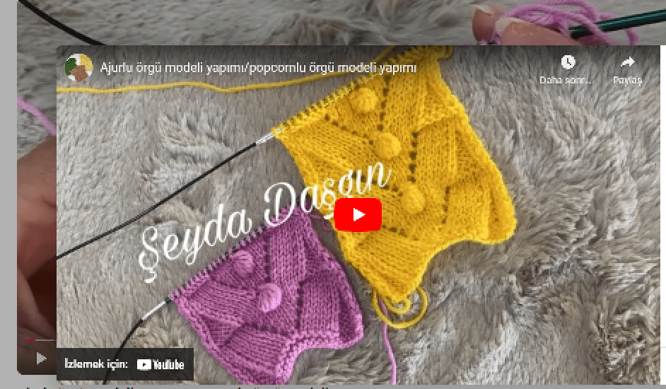 Popcornlu ajurlu örgü yapılışının tüm detayarını aşağıda vieolu olarak izleyebilirisniz..Ayrıca son eklemiş olduğumuz konu olan 2 şiş ile çocuk çorabi yapılışına ise buradan bakabilirsiniz.Yine son eklemiş olduğumuz konular arasında yer alan örgü pelerin yapılışını buradan izleyebilirsiniz