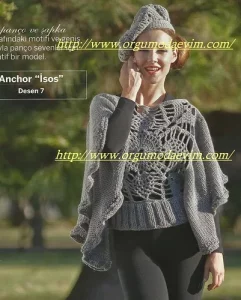 yapılışı:Ön ve arkaya 71 itmekle başlayın. Ajurla devam edin. Kol kesimi yapmayın. Yakayı kayık yaka yapın. 3 sıra haraşo Örüp tamamlayın. Kollara 69 ilmekle başlayın. Ajurla devam edin. Kol boyuna gelince ilmekleri kapatın. Ajur (13 ilmek üzerinde) l.sıra: düz örün, arka sırada ters örgü olarak örerken her ilmeğe 2 defa dolayarak örün. 2.sıra: doladığınız ilk ilmekten bir ters bir düz olarak 5 ilmek çıkartın. Sol şişteki 5 ilmeği boşaltıp düzden toplayın. Bu şekilde devam edin. Arka sırayı ters örün. 3.sıra: 5 ilmeği topla 1 ilmekten 5 itmek çıkar bu şekilde devam et. Arka sırayı ters ör. 4,sıra; 1 sıra düz ör arka sırada her ilmeğe 1 ilmek dolayarak ters örgü olarak örün. Bu şekilde devam edin.